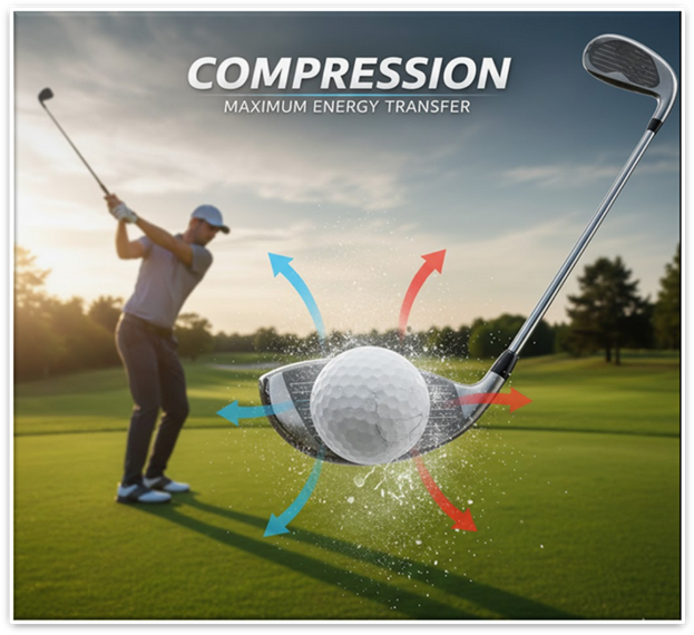 Ball compression happens when the clubface makes solid, centered contact with the ball — squeezing it against the clubface for a split second before launching it forward. This creates a powerful, penetrating ball flight and more consistent distance.